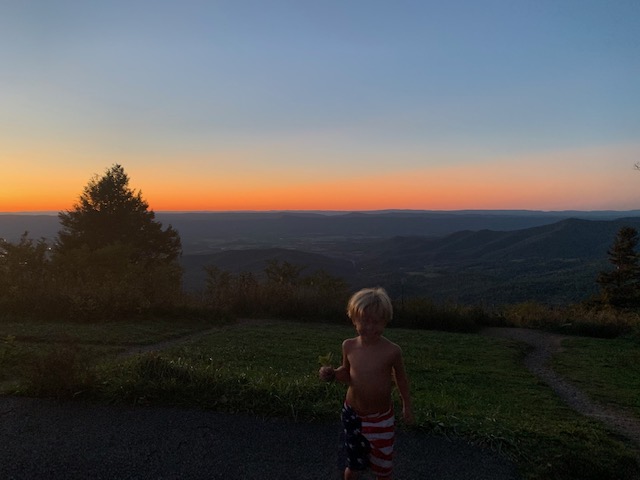We finally see the signs for Shenandoah National Forest, and then eventually the park itself. We are beginning to get very twisty turny in the mountains, and it is the Shadow Cruisers first time on this terrain so the nerves start to creep up. I can see Matt’s knuckles getting white, but it’s okay, we’re good. Oh….guess what time it is??? Almost 8 freakin o’clock at night. We barely make it up the mountain to the Skyline Drive just in time to catch the sunset. Skyline Drive is a 105 mile road that runs the entire length of the Shenandoah National Park. It is an absolute marvel. It was the total apex of the landscape high that we were on. Truly truly stunning. We get out at an overlook, with just about no clothes on and realize it has dropped at least 25 degrees. We were all shivering, but super stoked to be there. Henry got to take an epic dump with the camper door open overlooking the Shenandoah Valley at sunset. Lucky duck. But it is getting dark now and we still have miles and miles to go into the park to get to the campground. We drive and drive and the kids are getting crazier and crazier and queue my pms psychosis. We finally get to Big Meadows, and I am met with an instantly unsettling site…… there are other RVs…..pulling out as we are turning in. My spidy senses are telling me this is not good. Are they getting rejected from the first come first serve? Are we possibly not going to get a campsite? But we have got to get out of this truck!?!?!?! We get to the check in hut and mother *^#%^+….. there is a campground full sign up. So it’s 9:00 pm at this point. Y’all remember when we left Wilmington??? That’s right, 10:00 am. You calculate those hours. How can this be happening???? We don’t have a campsite!?!?!?! Oh yeah, I remember, all those rookie mistakes from earlier…..