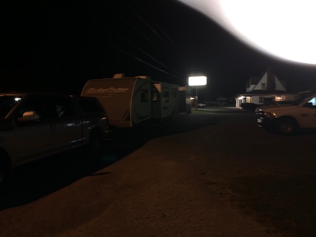 It’s 10 o’clock at night now. We have no cell service and no WiFi and seemingly no options…. yet we drive on. Up ahead we see a sign for Mountain View Motel…. our savior… our messiah….our holy grail….. but then….. oh shit…. we missed the turn in…. queue the cuss words. You know, that type of thing wouldn’t normally be a big deal, but when you’re hauling a trailer every single move is a big deal. And also let’s remember the time of night, my weak mental state, the cuckoo nest in the back seat, the angsty dog, the hangry, white knuckled dad……… I mean is it over yet???? We found somewhere to turn around and eventually find our way into the motel parking lot. The idea is that we are going to get a room and then run our extension cord through the window and just pull some power into the RV from the room. Great in theory, but our “approved” parking spot was nowhere near our room. The kids had already dialed in how terrifying the tiny motel cottages were and had vowed to not step foot in one. So it was camper or die.