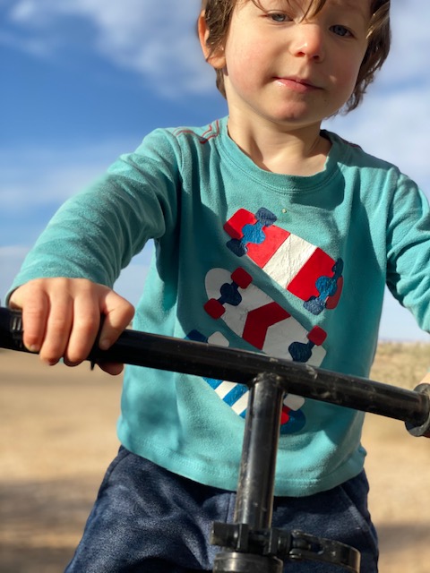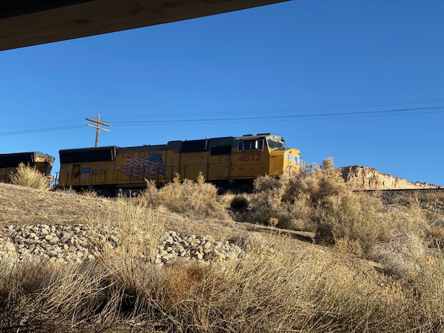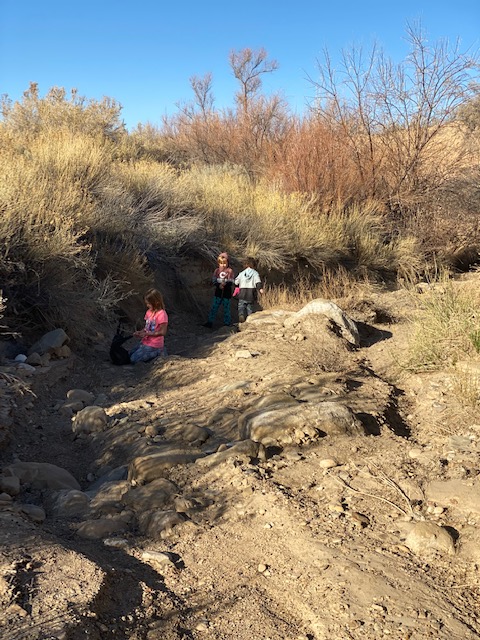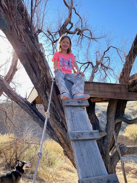 We go under the bridge, on which the sleeping train is parked….. pretty awesome getting so close. Trains make some cute noises when they are sleeping….sounds that resemble long sighs,hisses, and snores, reminiscent of a snoozing grandpa or a tuckered out pup dreaming in the sunshine. Now that we are closer we see there are actually two tracks running side by side. We duck under this behemoth, down a rocky hill and into the dried up creek bed under the tracks. The kids are “collectors” or maybe closer to hoarders, but lets just say collectors…. of all the things. Rocks, dried up plants, leaves, sticks, trash…. they prepped for their journey and have several bags that they are stuffing full of treasures. We follow the creek bed quite a ways and come upon a tree house! What a thrill! It’s more of a platform in a tree made with scraps of material, but it is a pretty fun find. (I went up and tested the structure before I let anyone else join, it was surprisingly sturdy) There is a ladder and a rope, and the platform is just high enough to get a lovely view of the surrounding dessert and canyons.